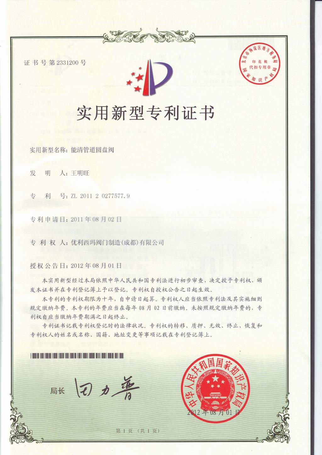 公司新型实用专利技术通过国家知识产权局的审查并予授证 (能清管道圆盘阀)